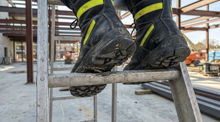 Standard safety boots, even heavy-duty ones, are designed with flexible soles for comfortable walking on flat ground. On a ladder rung, this flexibility becomes a critical weakness.