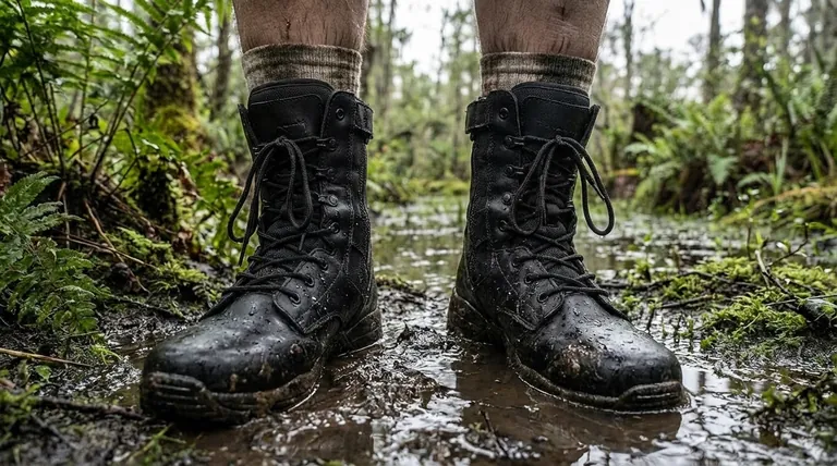 In a jungle or swamp, your feet will get wet, period. Water will come from river crossings, torrential rain, and, most significantly, from sweat. In this scenario, a waterproof barrier becomes a trap—it creates a personal swamp inside the boot. The correct design philosophy here is not to keep water out, but to get it out as fast as possible. This is the principle behind the classic jungle boot, which features drainage vents and quick-drying, non-absorbent materials. It is intentionally not waterproof.