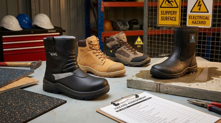 To choose the right safety boots, you must first perform a hazard assessment of your workplace. Boots with steel or composite toes protect against impact from falling objects, Electrical Hazard (EH) rated boots insulate against shock, slip-resistant outsoles provide traction on wet or oily surfaces, and waterproof materials are essential for wet conditions.