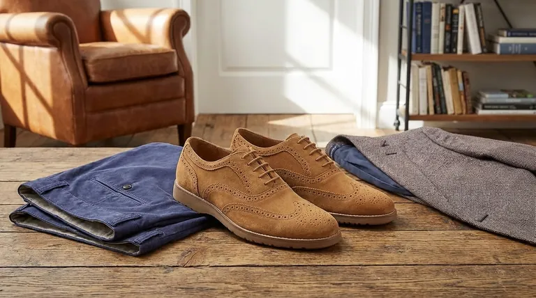 - If your primary focus is elevated weekend wear: A suede wingtip or a plain-toe in a lighter color like grey or navy pairs perfectly with chinos, cords, or dark denim.